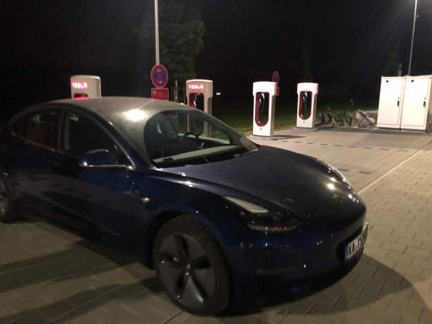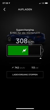 Unser erster Halt sollte nach 149km der Supercharger in Ulm Seligenweiler sein. Dieser einfach nur, um einen Kaffee zu holen. Rechnerisch notwendig wäre er eigentlich nicht gewesen. Seligenweiler erreichten wir um 3:40. Ich konnte fast die gesamte Strecke mit Autopilot durchfahren, außer an stellen, an denen es möglich war mehr als 150 km/h zu fahren. Leider war um den supercharger nicht möglich dort einen Kaffee zu bekommen, da die Raststätte erst um 6 Uhr wieder öffnet. Um zur Esso-Tankstelle in der Nähe zu laufen war mir der Weg allerdings zu weit. Auf die Toilette kann man nachts dort übrigens im Hotel neben dem Supercharger. Bis alle wieder im Auto auf ihren Plätzen waren hatte ich dann 20 Minuten geladen und lag bei 92% SOC.