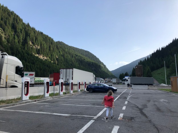 Auf der weiteren Fahrt über die A8 Richtung Brennero nahm der Verkehr nun stetig zu. Autopilot war weitgehend problemlos möglich, so daß es sehr entspannt weiterging. Weitere 274 km waren somit kein Problem so daß wir den supercharger mit 21% SOC erreichen konnten. Hier gab es erstmal Frühstück. Preislich absolut TOP, Kaffee für 2€ und frische Croissants für 1,60€. Nach einer gemütlichen, doch etwas ausgedehnteren Pause konnten wir mit 95% unsere Fahrt fortsetzen. Die länge der Pause war nicht durch das laden bestimmt, sondern durch das anstehen im Shop, das Frühstück usw. Da musste eher das Fahrzeug auf uns warten.