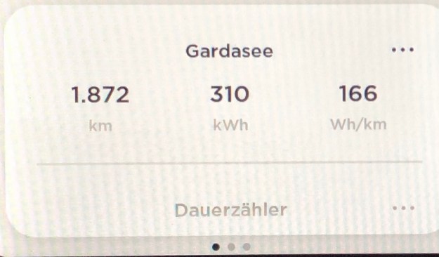 Der Gesamtverbrauch für die Tour incl. Fahrten vor Ort: 310 kWh für 1872 gefahrene km. Bezahlt für Strom habe ich durch die inkludierte Superchargernutzung nichts.
